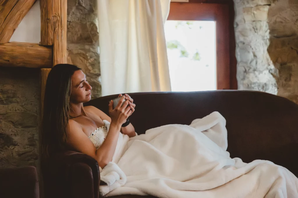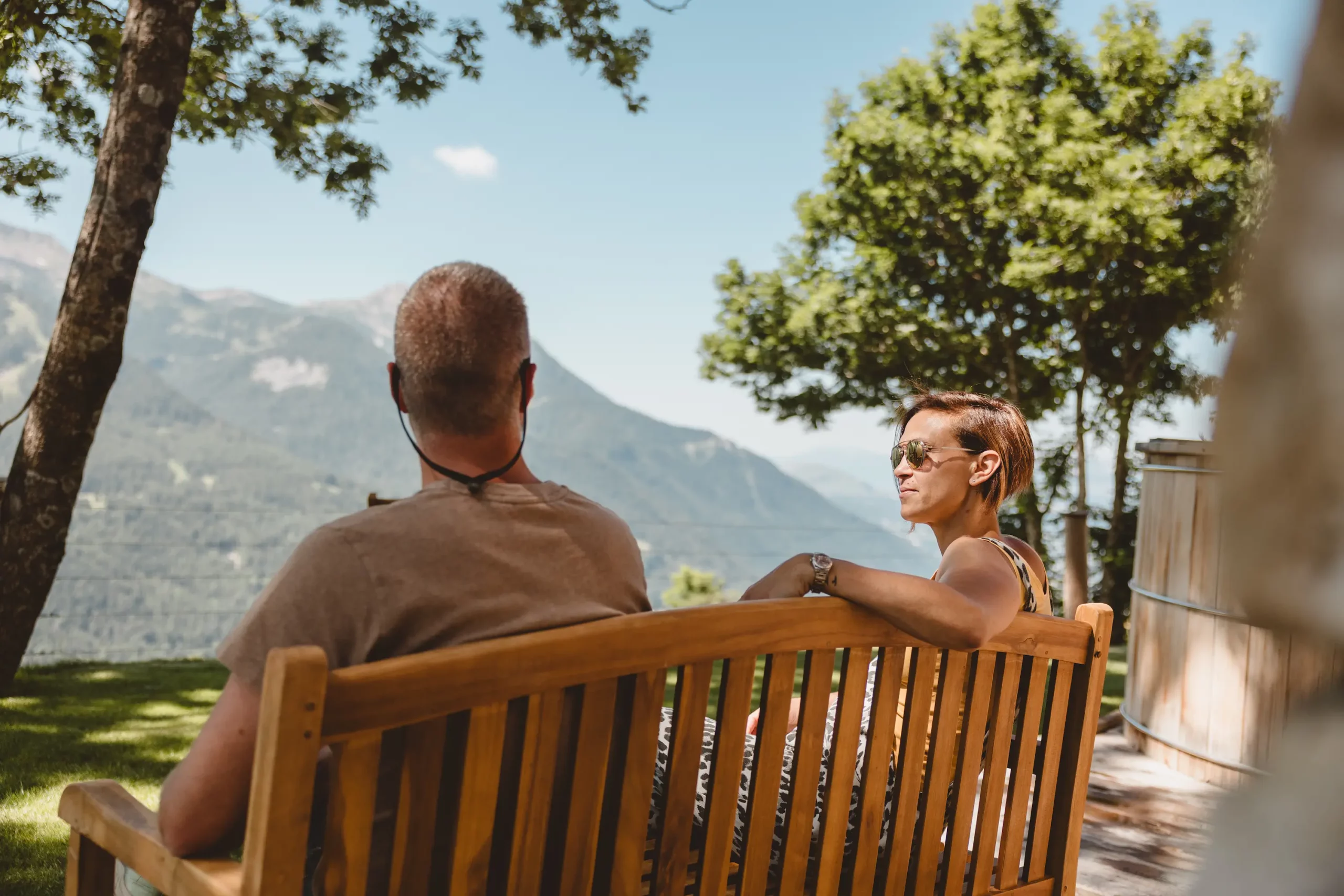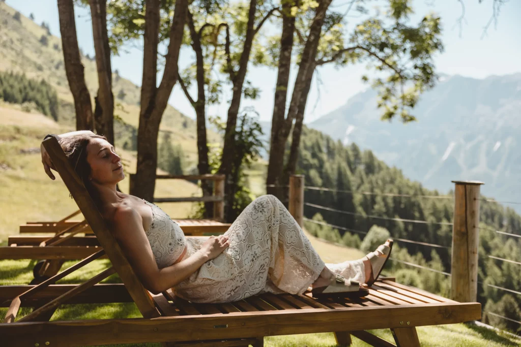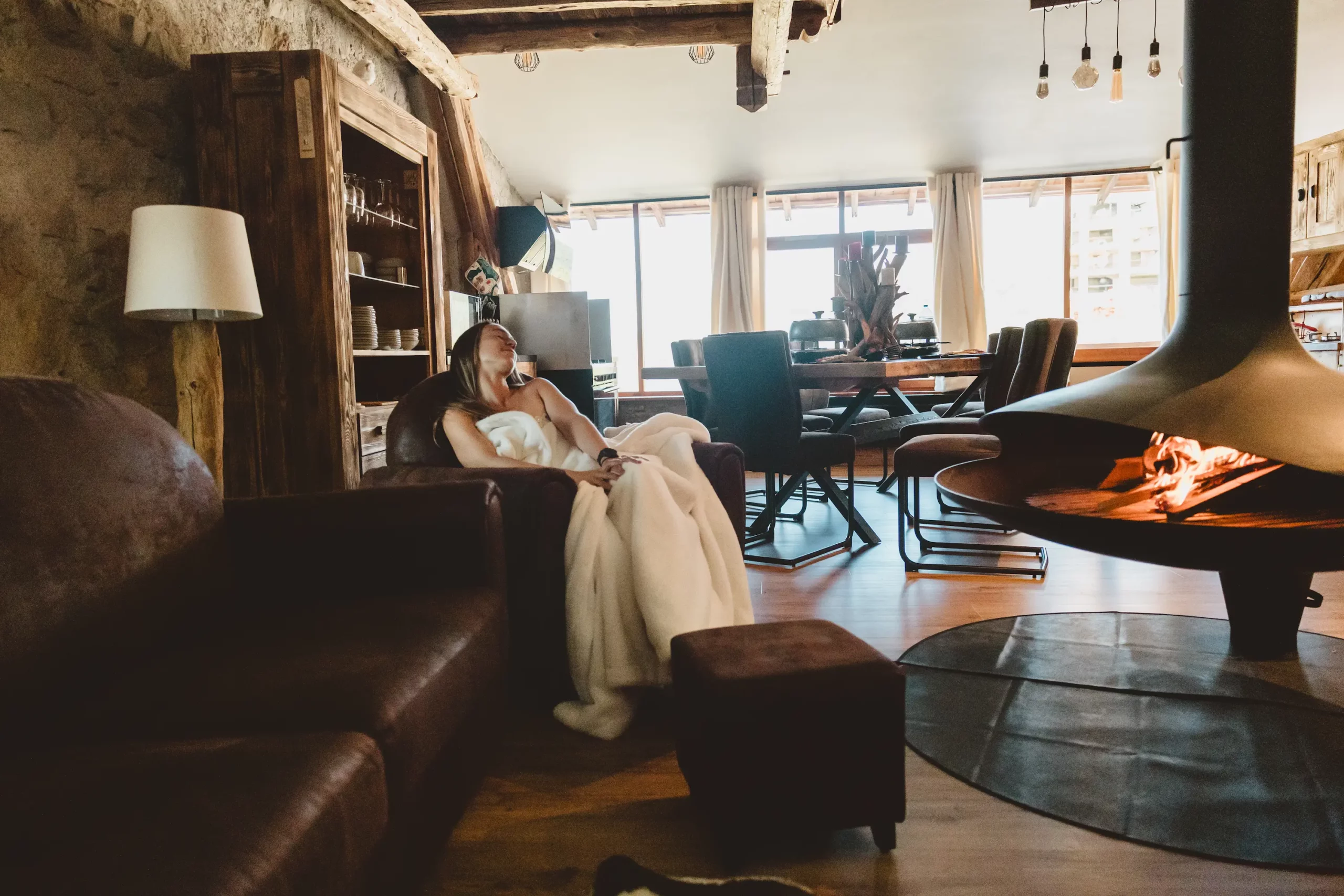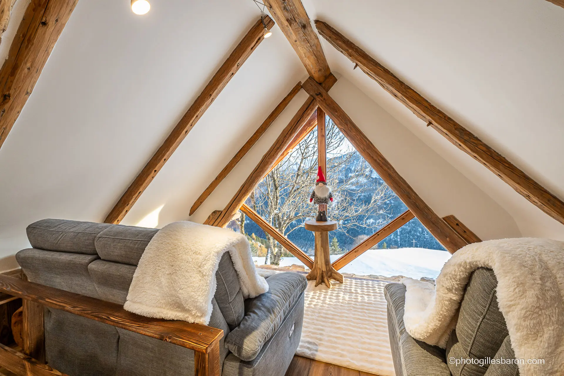 Un coin lecture cosy, avec fauteuils relaxants et canapé deux places, vous permet de vous détendre en profitant de la vue splendide sur la montagne. C’est l’endroit idéal pour un moment de calme ou de lecture après une journée d’aventure en pleine nature.