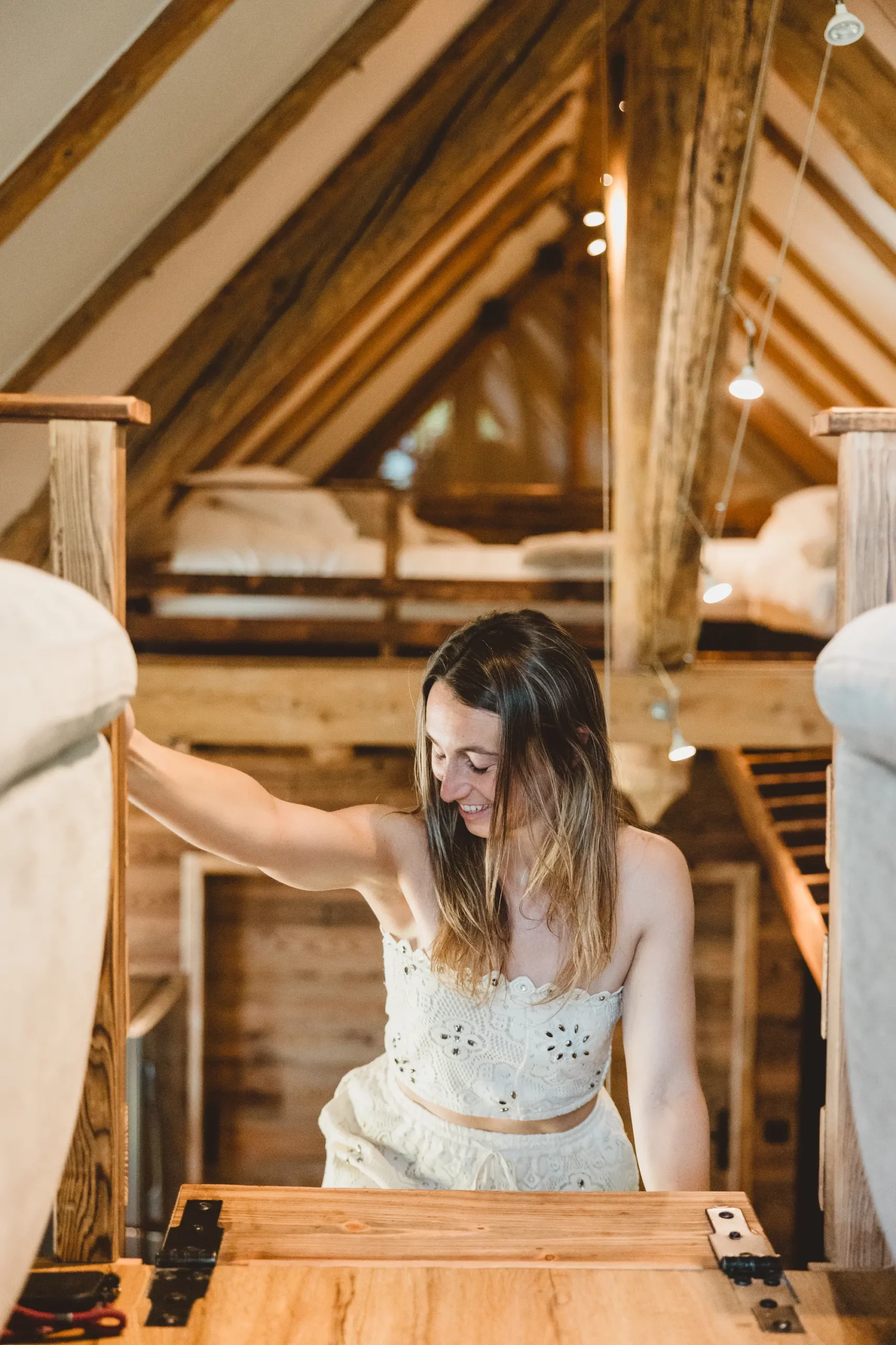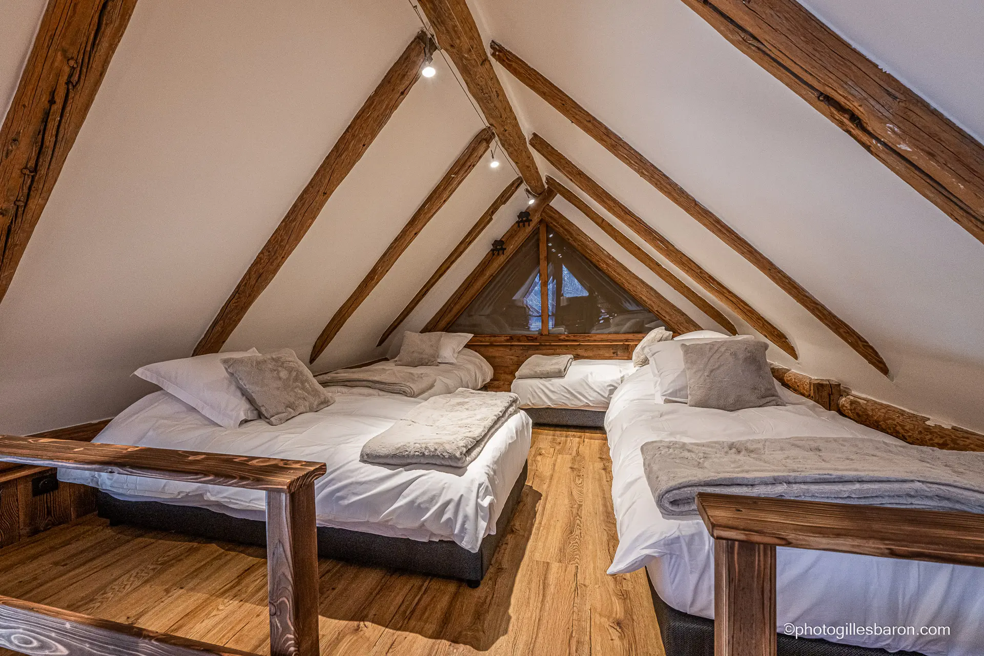 À l’étage, la Chambre 4 – Le Coupa vous accueille. Vous y trouverez également une salle de bain avec douche à l’italienne et WC. La mezzanine nuit dispose de 4 lits individuels, parfaits pour les enfants ou les amis, offrant ainsi un espace supplémentaire pour vos invités. Chaque chambre est équipée d’une tablette, d’une lampe de chevet et d’une prise par personne, ainsi que d’un placard intégré avec penderie et étagères pour un rangement optimal.