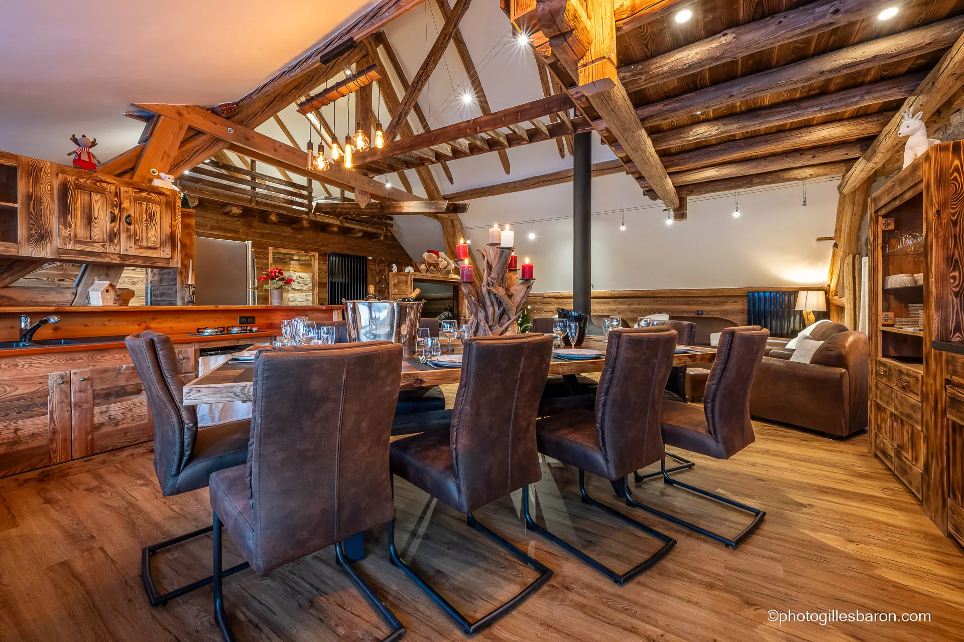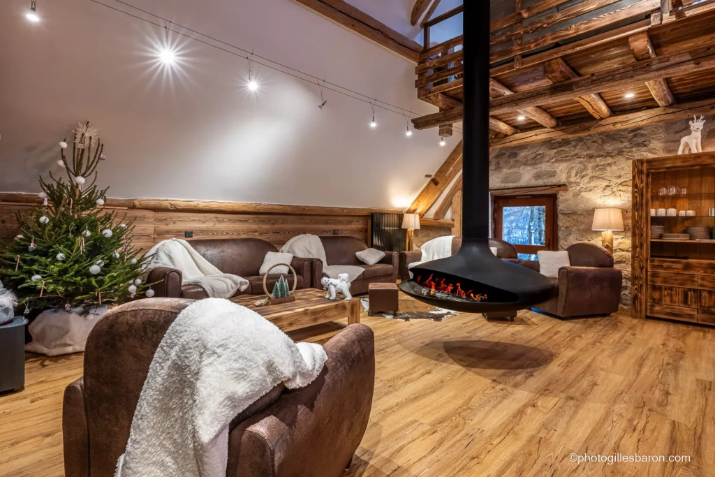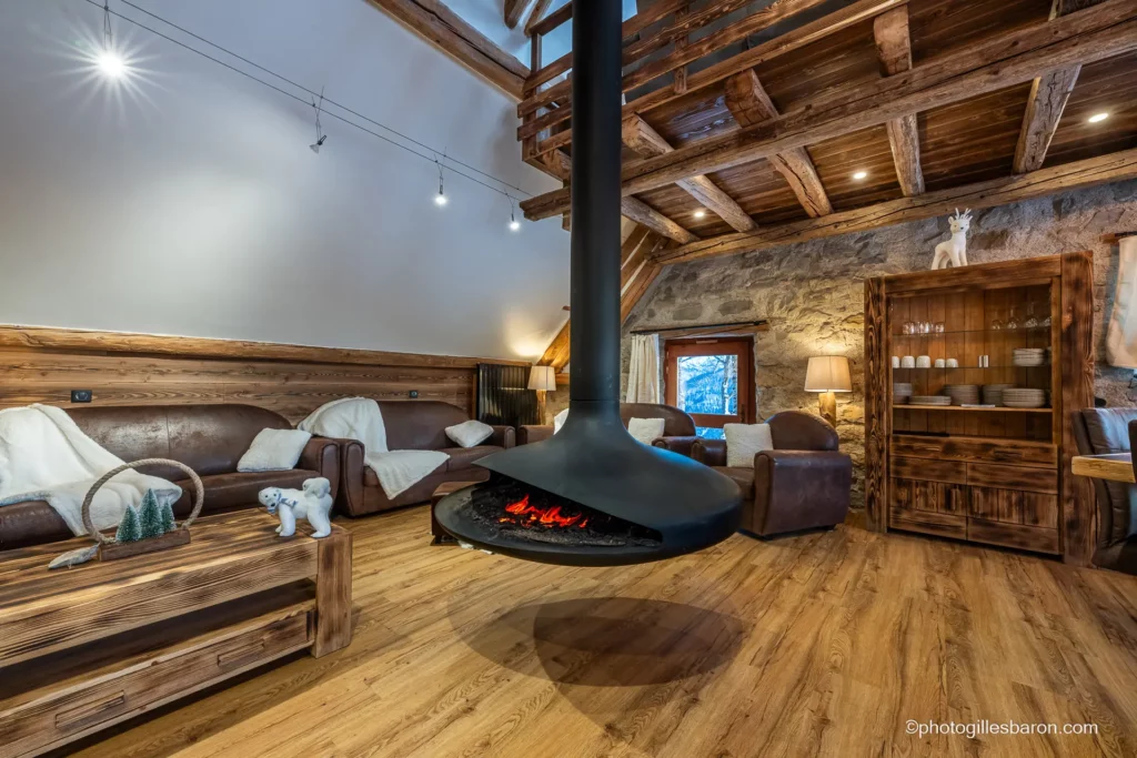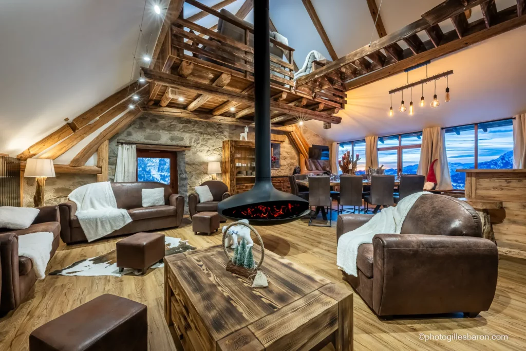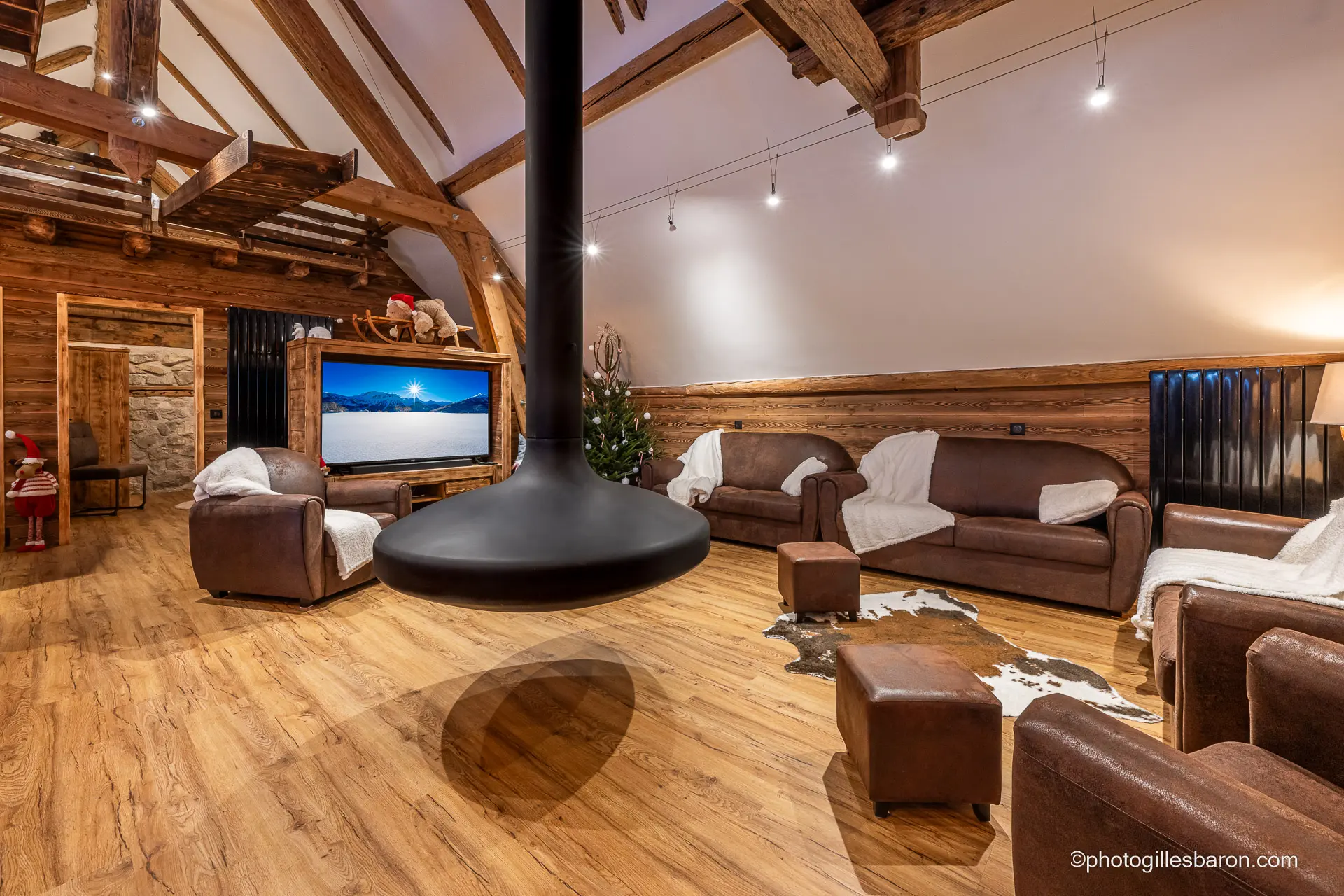 Le chalet dispose d’un vaste séjour lumineux, avec une vue imprenable sur la vallée. Vous y trouverez trois canapés et fauteuils confortables. Le salon est équipé d’une télévision connectée avec home cinéma et caissons de basse, idéal pour des soirées cinéma ou des moments de détente en toute convivialité. Une cheminée centrale suspendue ajoute à l’atmosphère chaleureuse et accueillante du chalet.