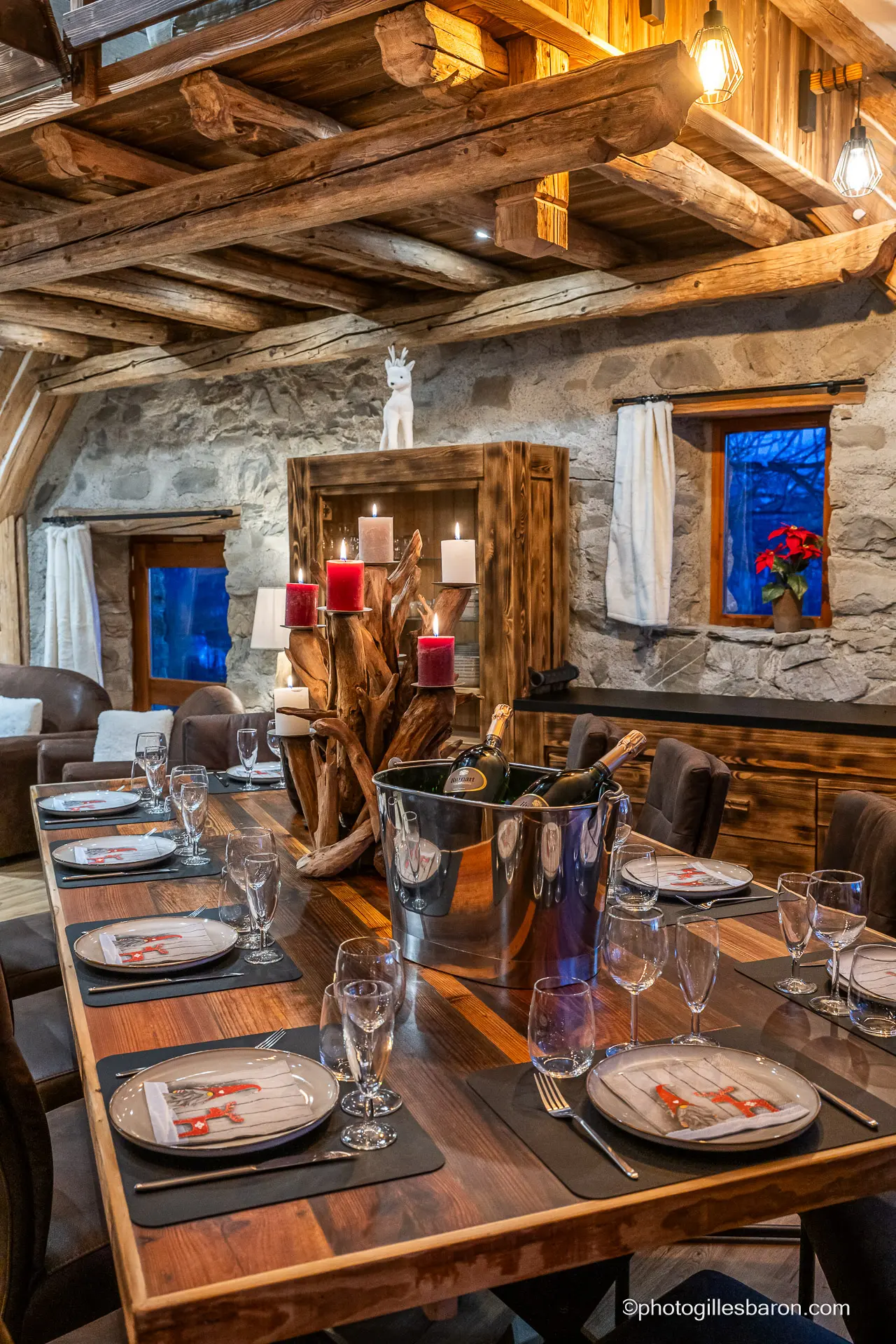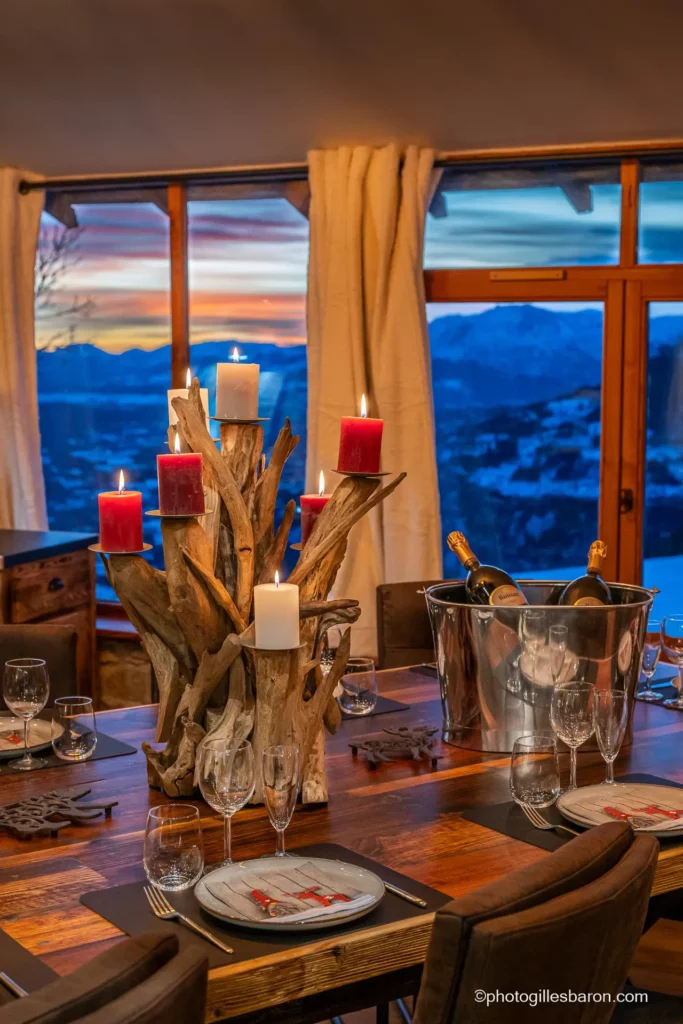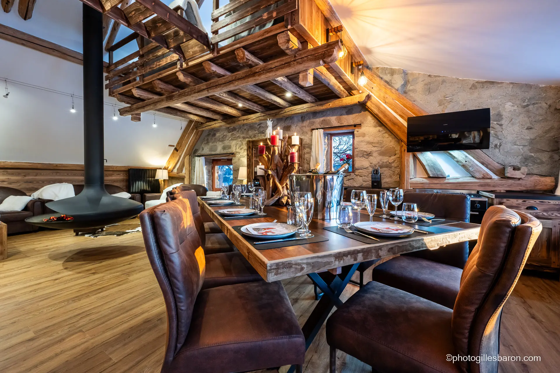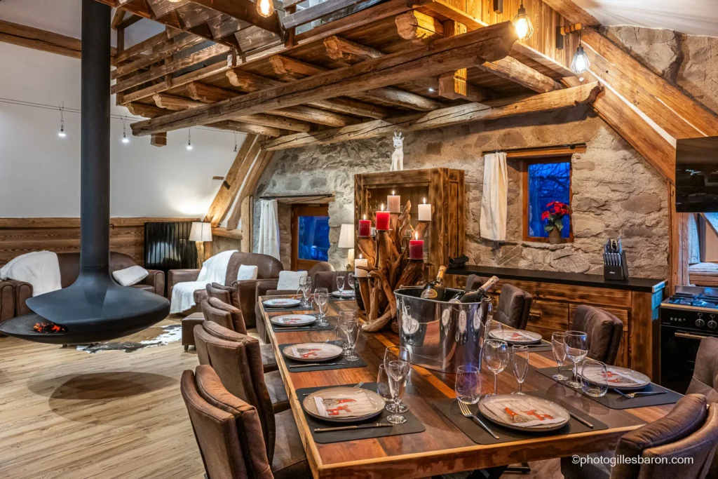 Le chalet dispose d’un vaste séjour lumineux, avec une vue imprenable sur la vallée. Vous y trouverez trois canapés et fauteuils confortables. Le salon est équipé d’une télévision connectée avec home cinéma et caissons de basse, idéal pour des soirées cinéma ou des moments de détente en toute convivialité. Une cheminée centrale suspendue ajoute à l’atmosphère chaleureuse et accueillante du chalet.